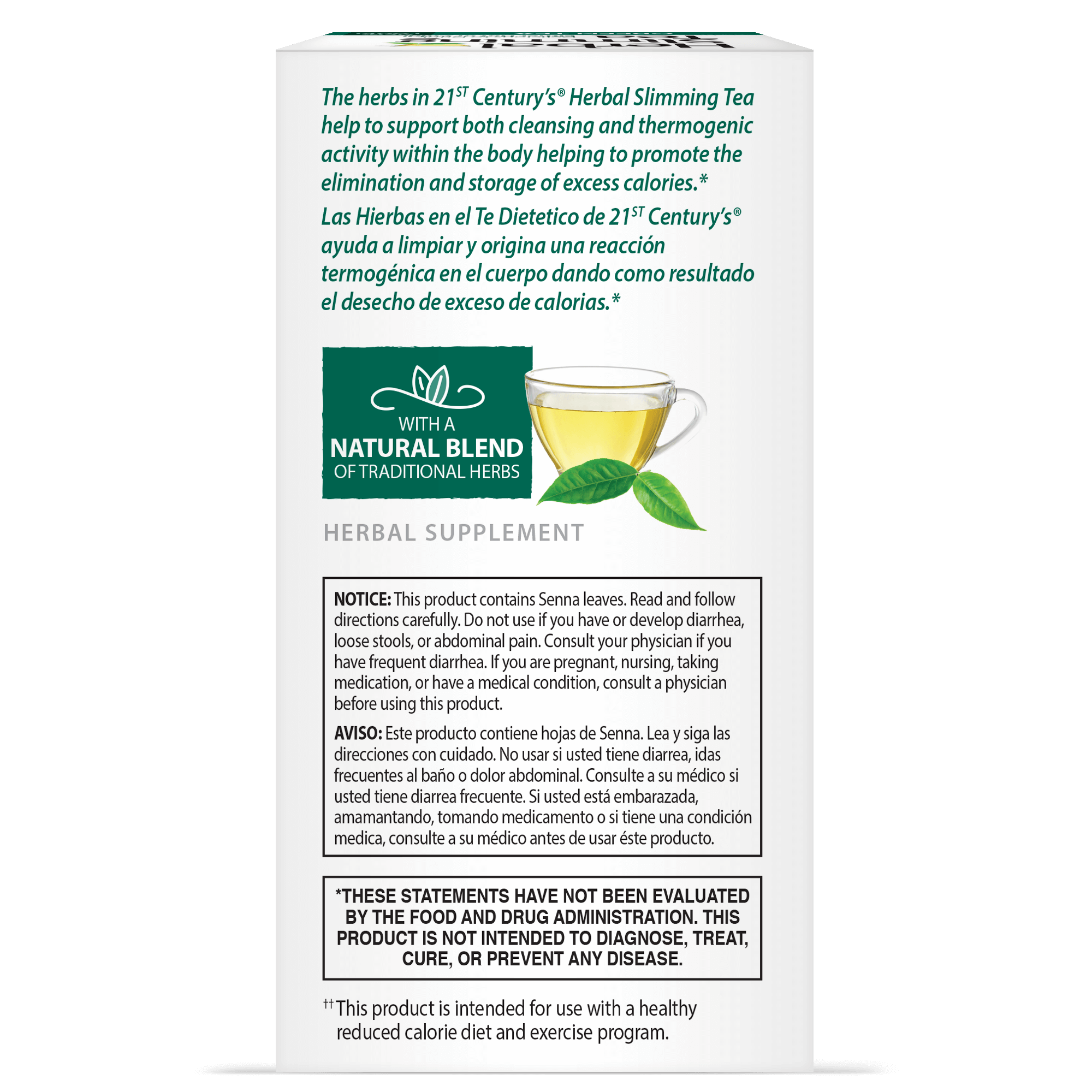 The herbs in 21st Century’s® Herbal Slimming Tea helps to support both cleansing and thermogenic activity within the body helping to promote the elimination and storage of excess calories.