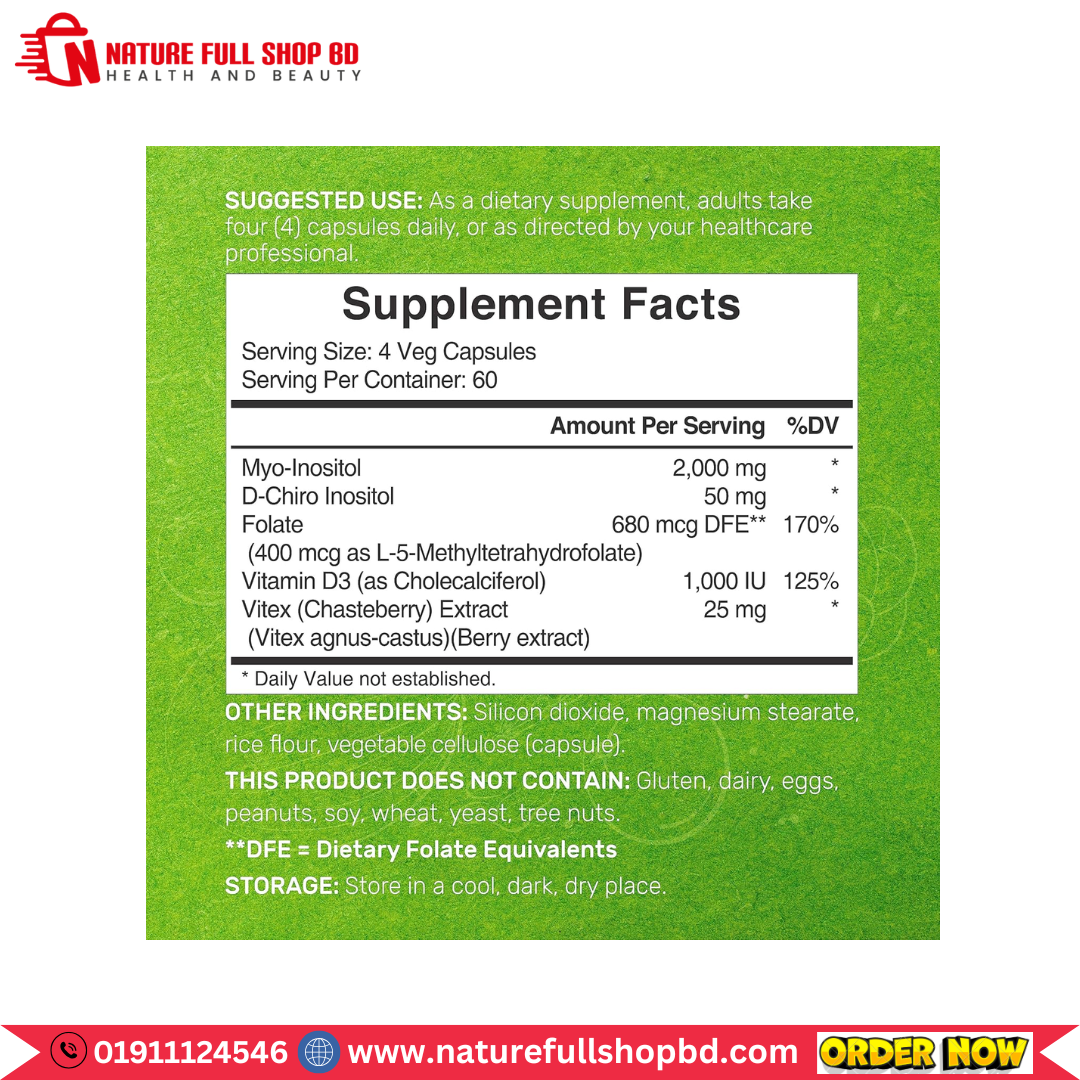 • Supply & Servings – 240 veggie capsules per bottle, 4 veg capsule serving size, 2,000mg Myo-Inositol, 50mg D-Chiro Inositol, 680mcg DFE Folate, 1,000iu Vitamin D3, and 25mg Vitex Berry Extract per serving, lasts up to 60 days.