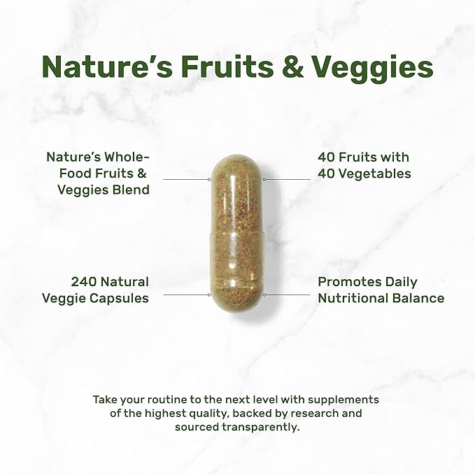 - Special Features – Nature’s Fruits & Veggies whole food supplement. 240 veggie capsules packed with 80 fresh superfoods. Retains natural vitamins, minerals, phytonutrients, and antioxidants.