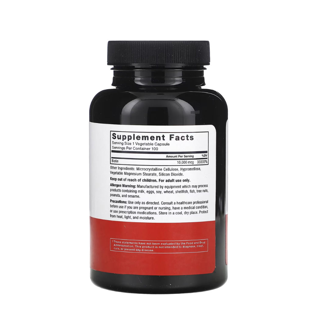 Ingredients You Can Trust: No Artificial Colors, No Artificial Flavors, No Gelatin, No Sugar, No Artificial Sweeteners, No Preservatives. Serving Size: 1 Vegetable Capsule, Servings Per Container: 100, Amount Per Serving: Biotin 10,000 mcg (33333% DV), Other Ingredients: Microcrystalline Cellulose, Hypromellose, Vegetable Magnesium Stearate, Silicon Dioxide.
