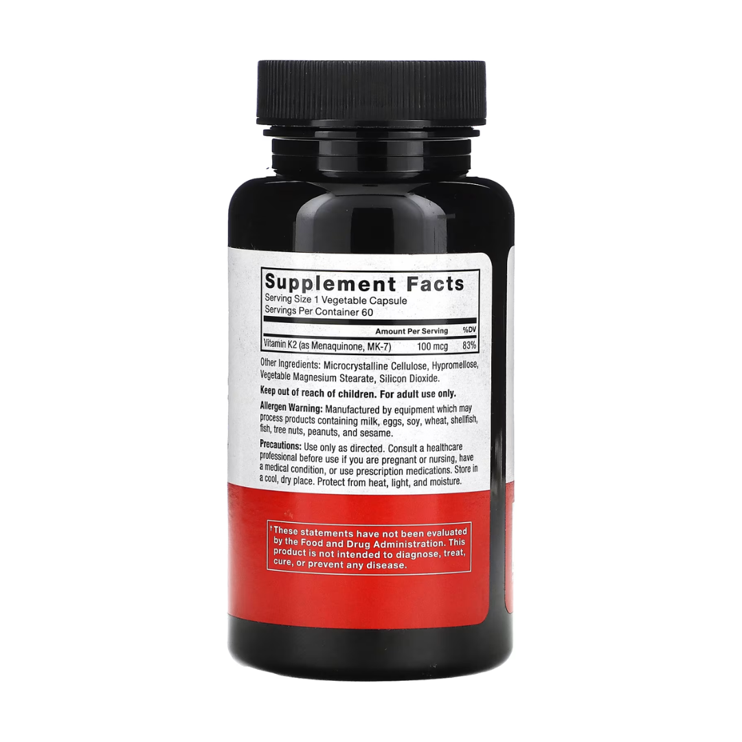 Ingredients You Can Trust: No Artificial Colors, No Artificial Flavors, No Gelatin, No Sugar, No Artificial Sweeteners, No Preservatives. Serving Size: 1 Vegetable Capsule, Servings Per Container: 60. Amount Per Serving % DV, Vitamin K2 (as Menaquinone, MK-7) 100 mcg, 83%. Other ingredients: Microcrystalline Cellulose, Hypromellose, Vegetable Magnesium Stearate, Silicon Dioxide.