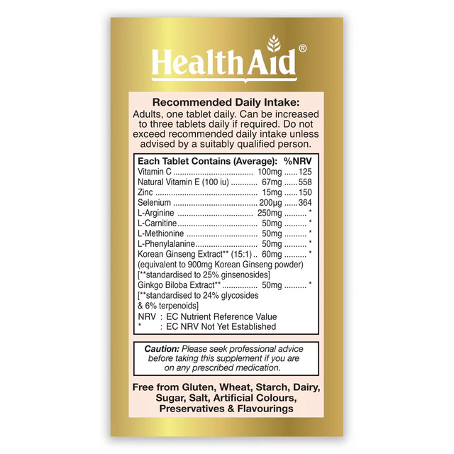 Ingredients Ingredients: Bulking Agent (microcrystalline cellulose, dicalcium phosphate), L-Arginine HCl, Vitamin C (ascorbic acid), Natural Vitamin E (d-alpha tocopheryl acetate), L-Carnitine-L-Tartarate, Anti-caking Agent (silicon dioxide, veg. magnesium stearate), Korean Ginseng (Panax ginseng) Root Extract, L-Phenylalanine, L-Methionine, Standardised Ginkgo Biloba Leaf Extract, Glazing Agent (hydroxypropyl methylcellulose, glycerin), Binding Agent (acacia gum), Zinc Oxide, Sodium Selenite (Selenium).
