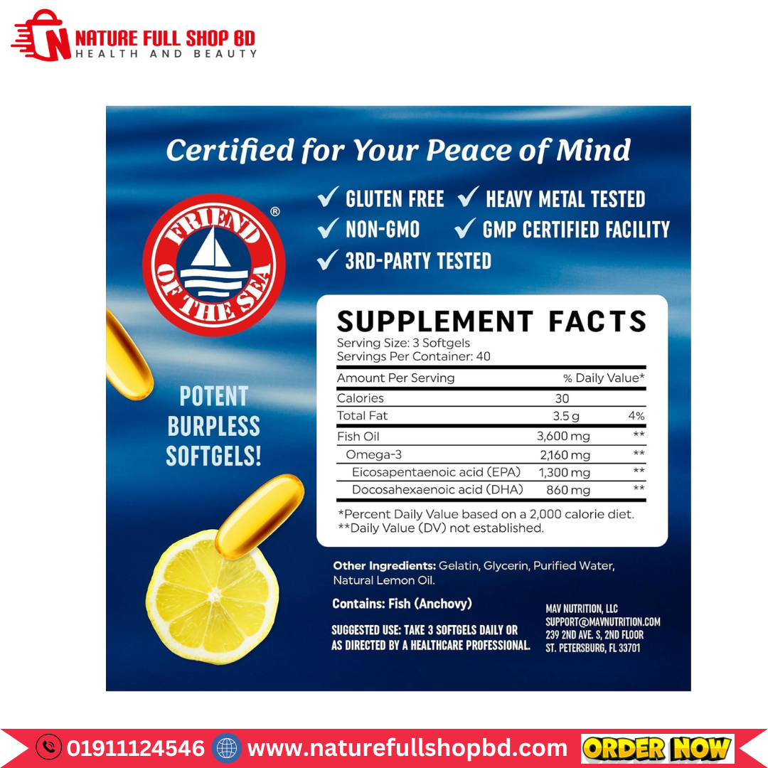 Mav Nutrition Triple Strength Omega-3 Fish Oil 3600 mg Fatty Acids 1300 mg EPA + 860 mg DHA 120 Softgels