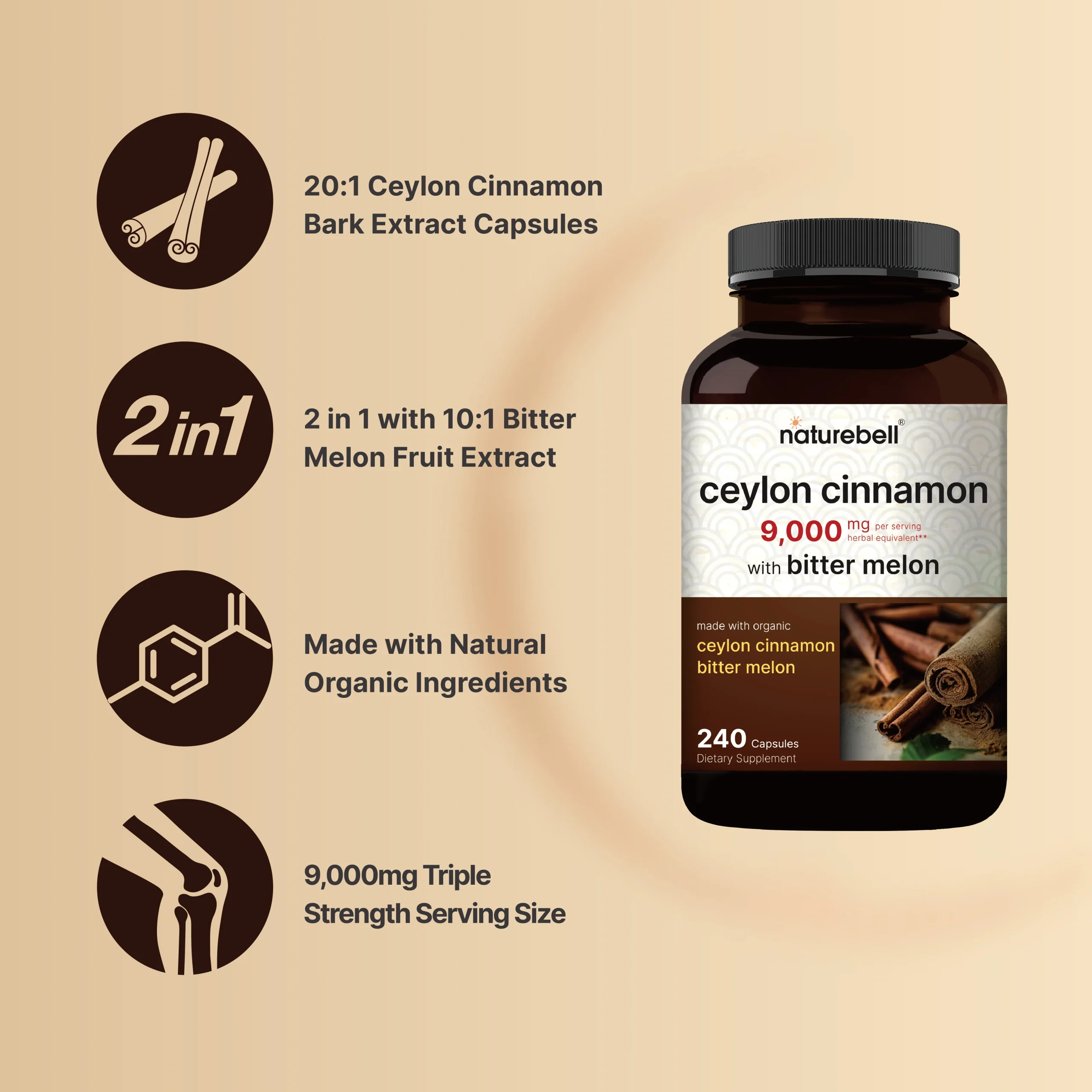 NatureBell Ceylon Cinnamon 9,000mg Per Serving, 240 Capsule