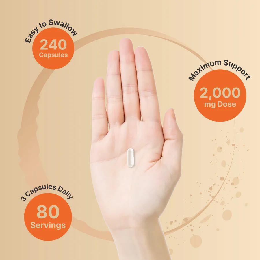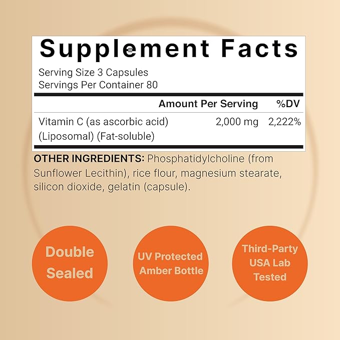 - High bioavailable liposomal vitamin C capsules, 240 capsules per bottle with 80 servings that contain a max strength 2,000mg dose from pure fat-soluble ascorbic acid.