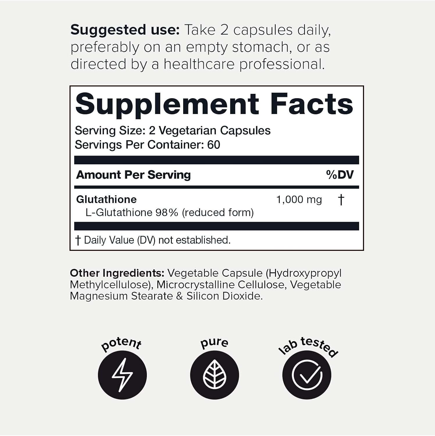 • 98% Pure Glutathione – Our supplement offers 1000mg of reduced glutathione per capsule, meticulously purified through advanced filtration to ensure 98% purity, significantly enhancing its efficacy in supporting cellular health.